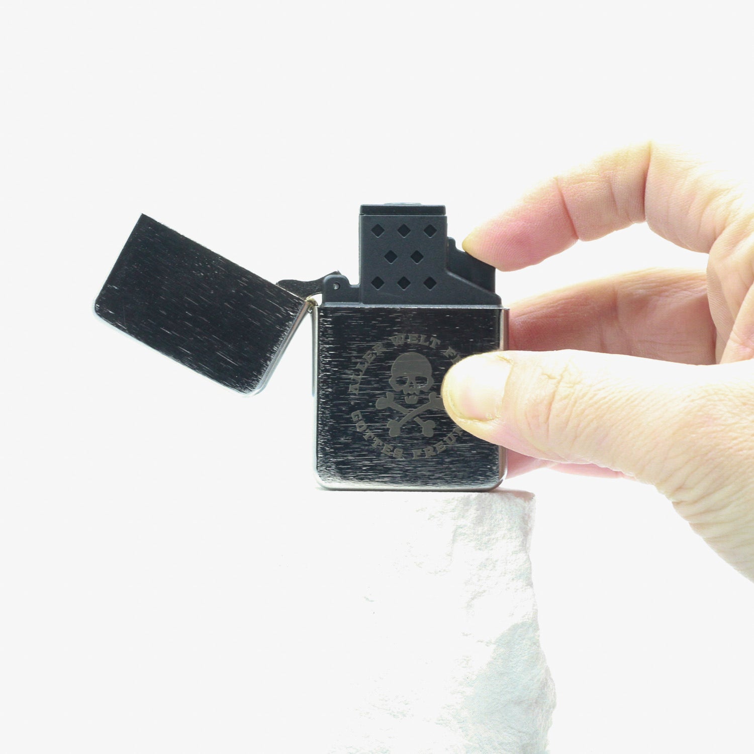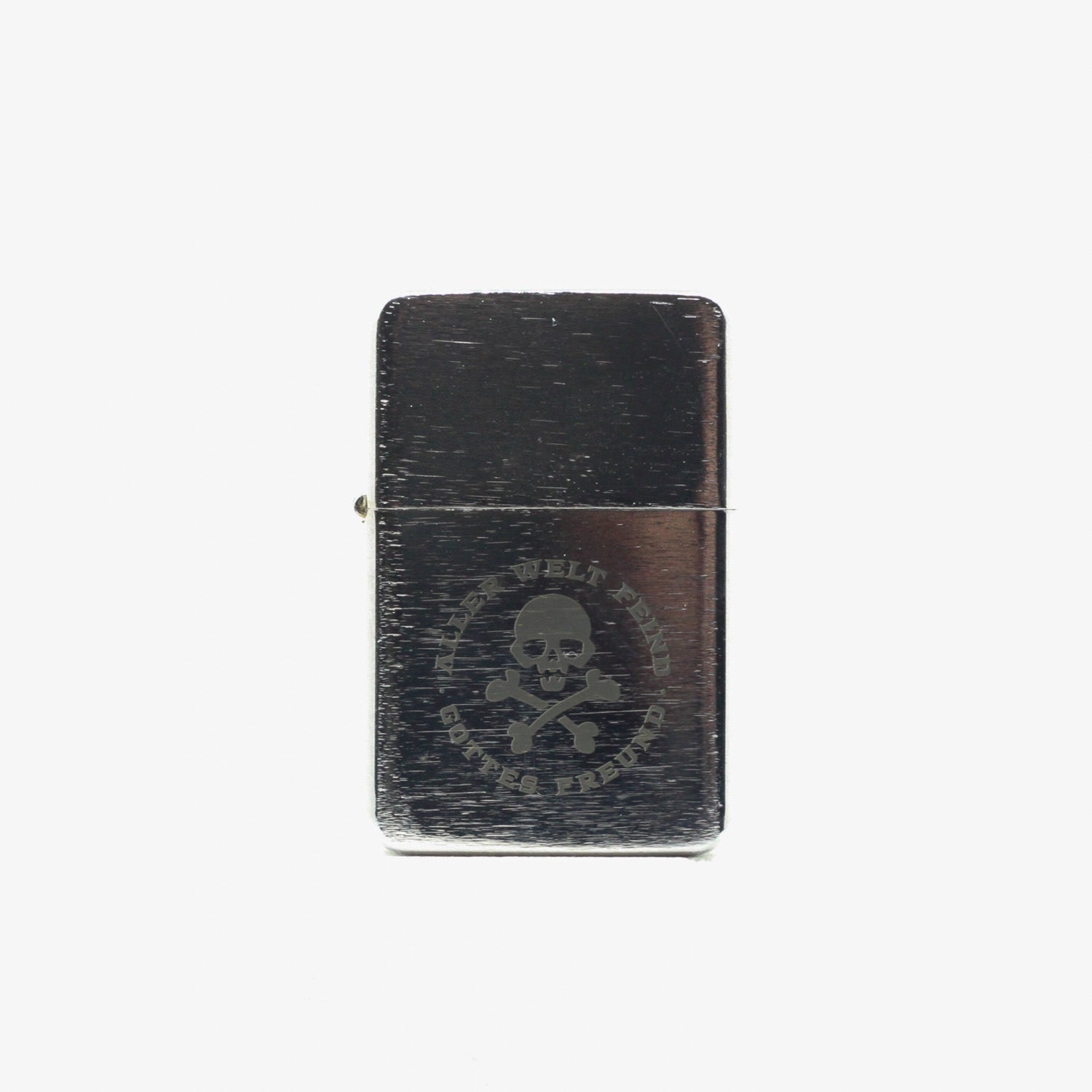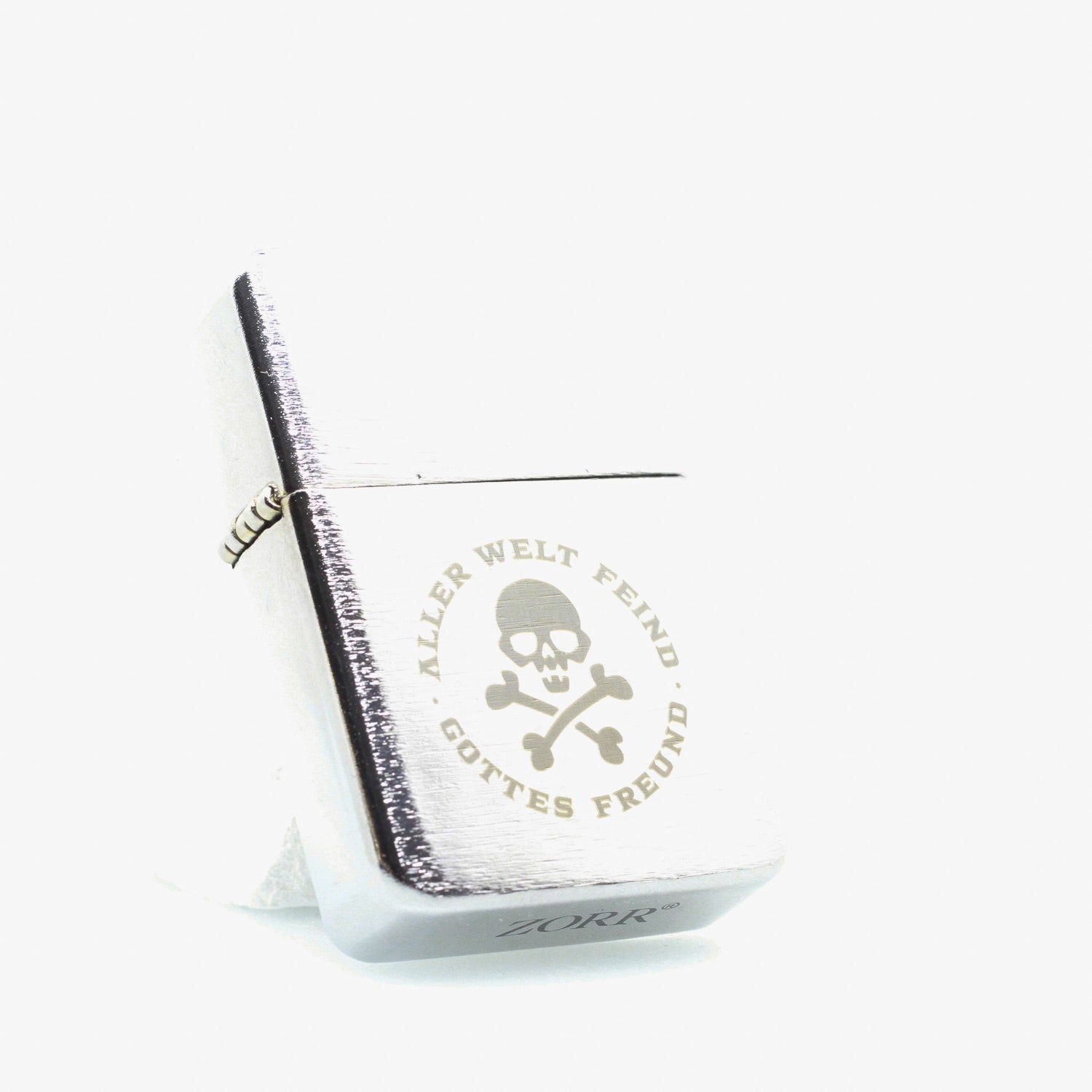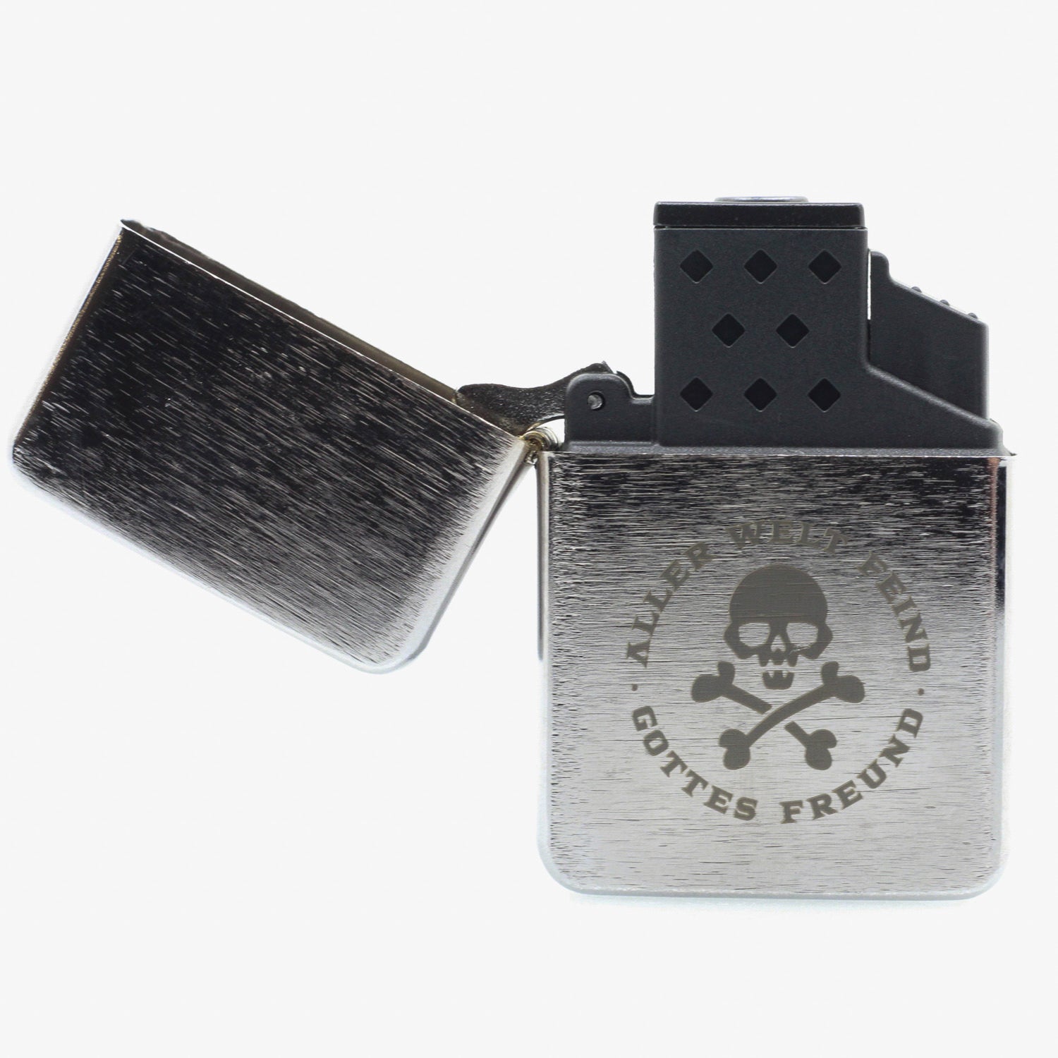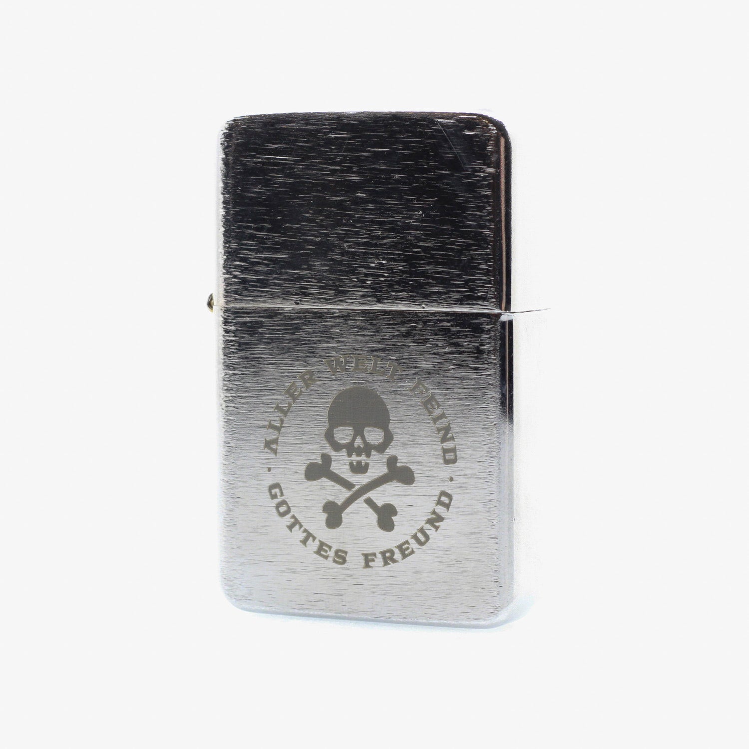 Die einseitige Logogravur „Gottes Freund & Aller Welt Feind 2.0“ verleiht dem Feuerzeug einen klaren Statement-Charakter. Dank seiner kompakten Maße passt es bequem in jede Tasche. Geliefert wird das Feuerzeug einzeln in einer Box und eignet sich damit auch ideal als Geschenk oder Sammlerstück.