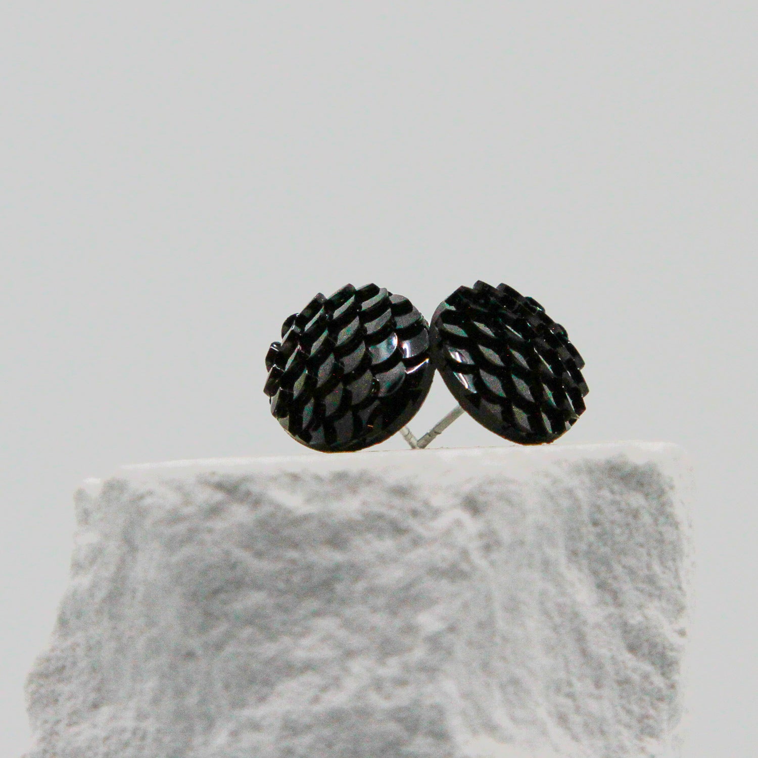 Minimalistisch und stilvoll: Die schwarzen Ohrstecker sind echte Allrounder. Das dezente Schuppenmuster verleiht ihnen eine besondere Struktur – perfekt für Alltag und Abendlook.