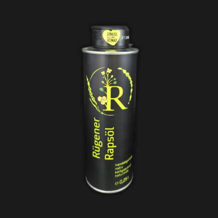 Bestes, mehrfach prämiertes und im besonders schonenden Kaltpressverfahren gewonnenes Rügener Rapsöl wird per Hand in dekorative und zugleich praktische Weissblechdosen gefüllt. Unser Rapsöl hat eine goldgelbe Farbe und einen angenehm nussig feinen Geschmack.
